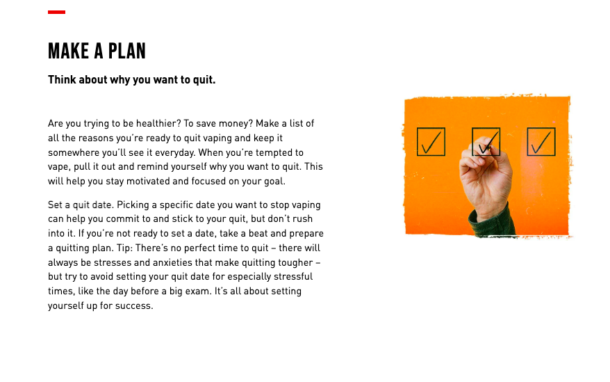 After realizing that many young vapers not only wanted to quit but were also looking for support and mental health resources, we began to offer tips and advice for quitting on the truth website — like the page I wrote below.