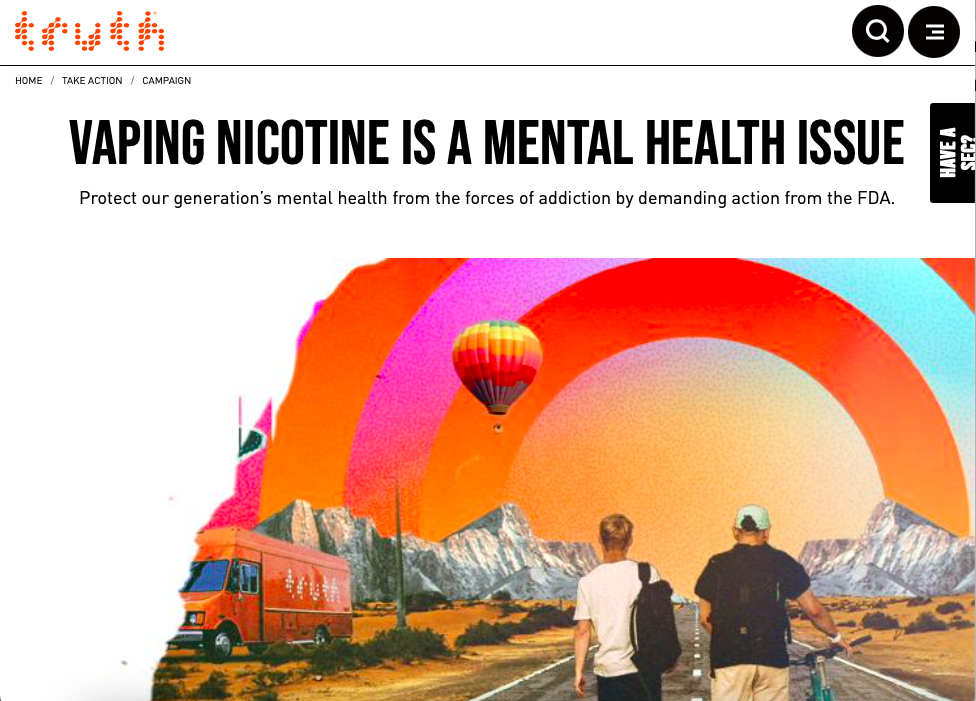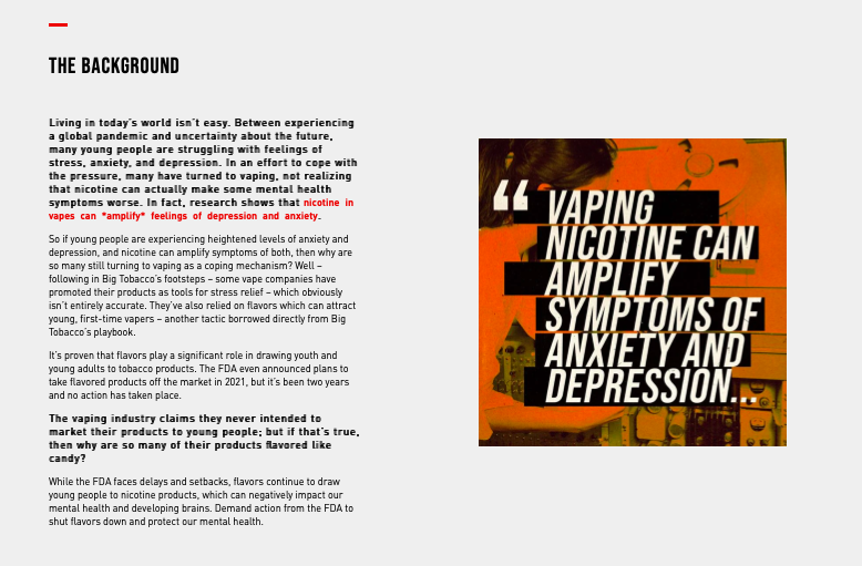 Each year, the truth marketing department works with our college activism team to execute three campaigns around vaping and how it impacts important issues facing young people today: social justice, the environment, and mental health. The goal of these campaigns is to spread awareness and empower young people to take action — both online and on-the-ground — and create change.